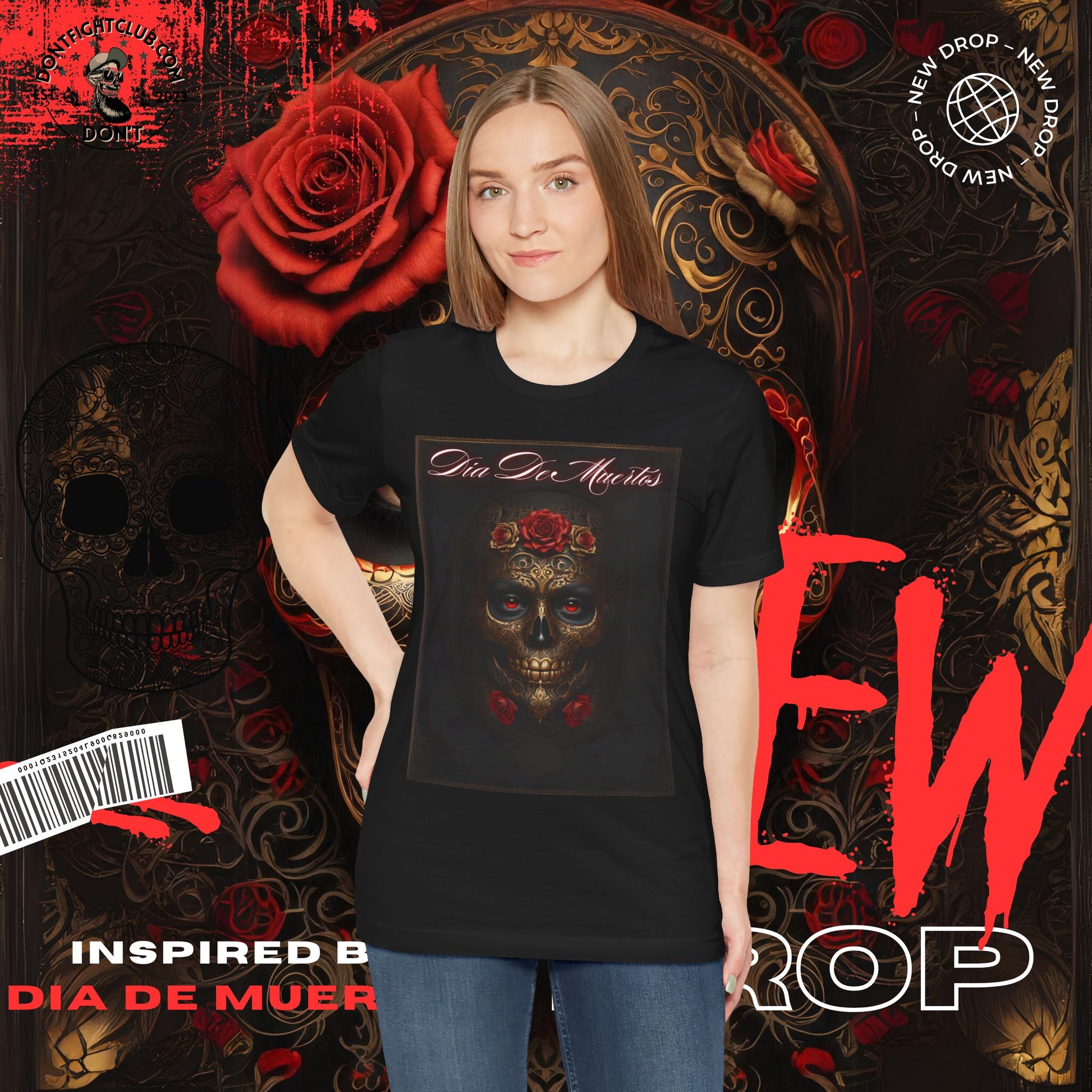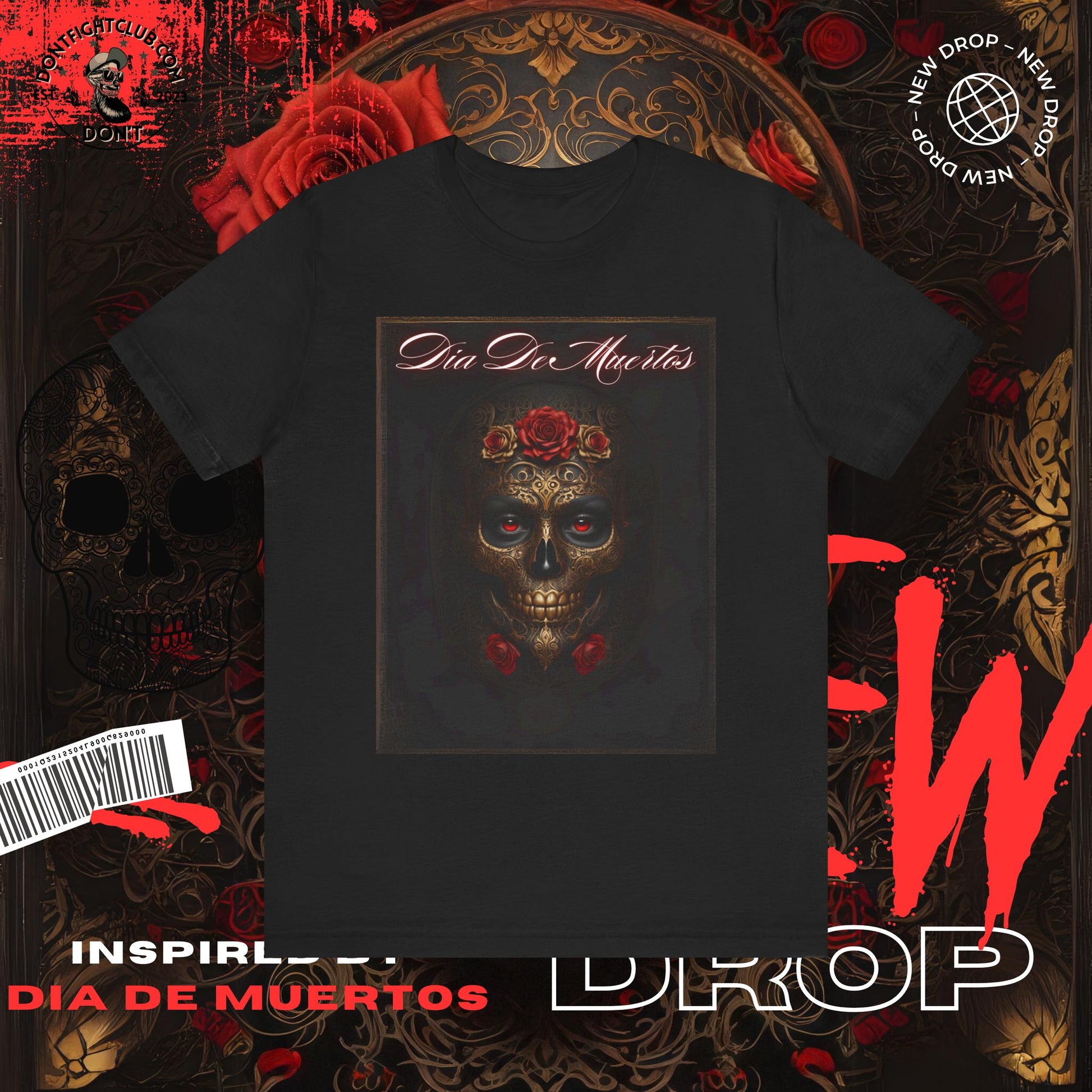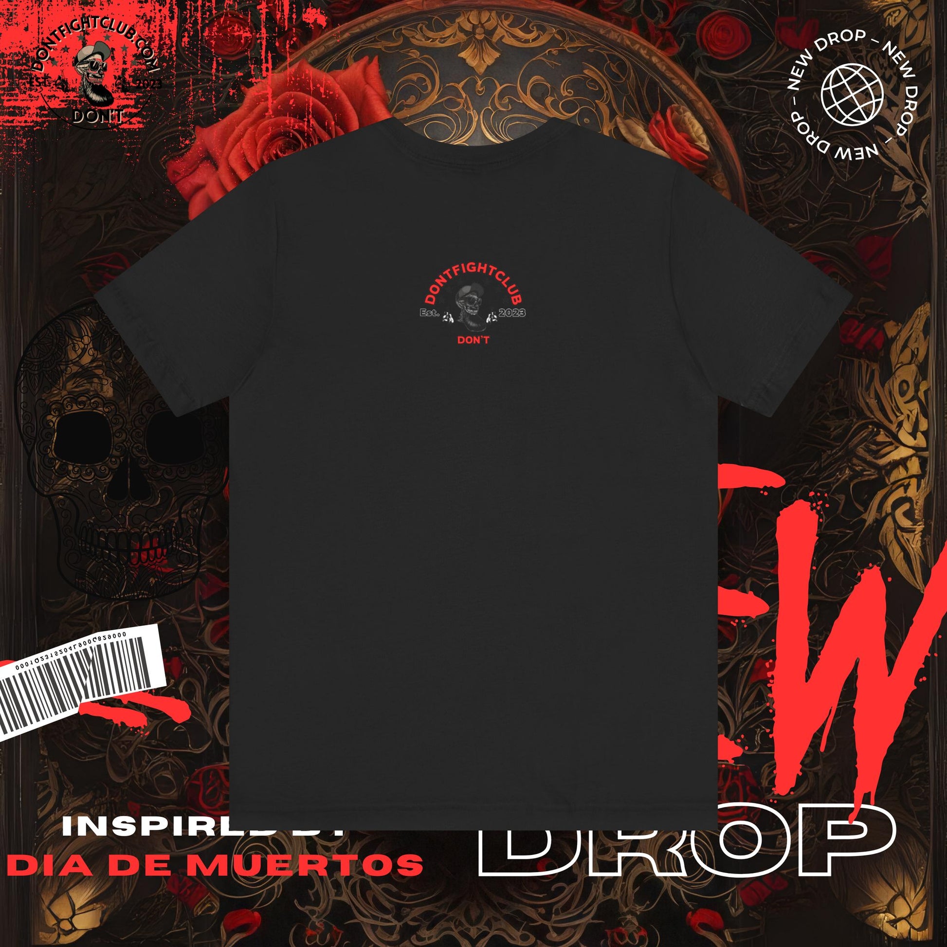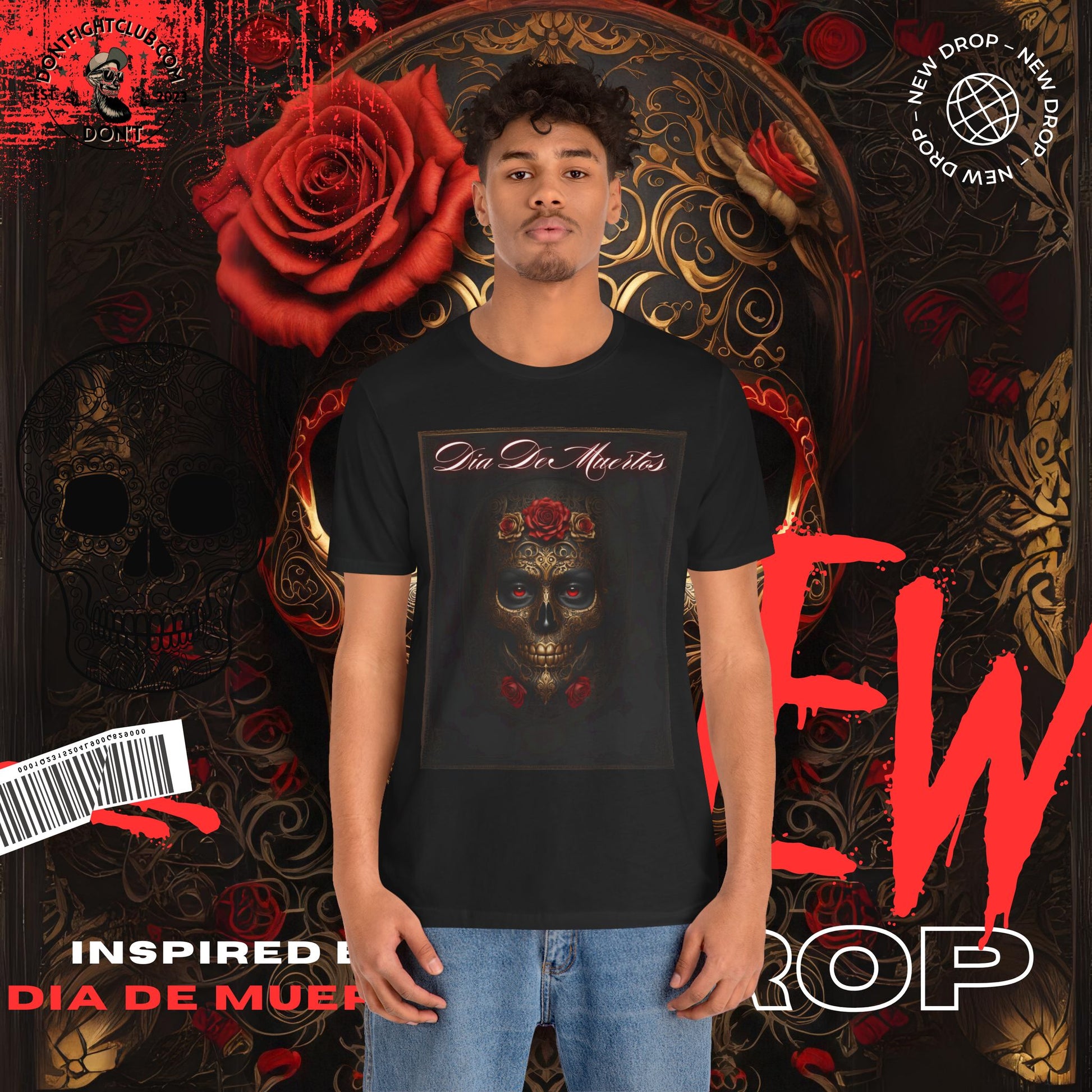 A black T-Shirt with a design inspired by Dia De Muertos, giving off a festive and cultural vibe. Perfect for anyone looking to celebrate Day of the Dead or add some Mexican heritage to their wardrobe. Suitable for casual wear or as a statement piece for special occasions.